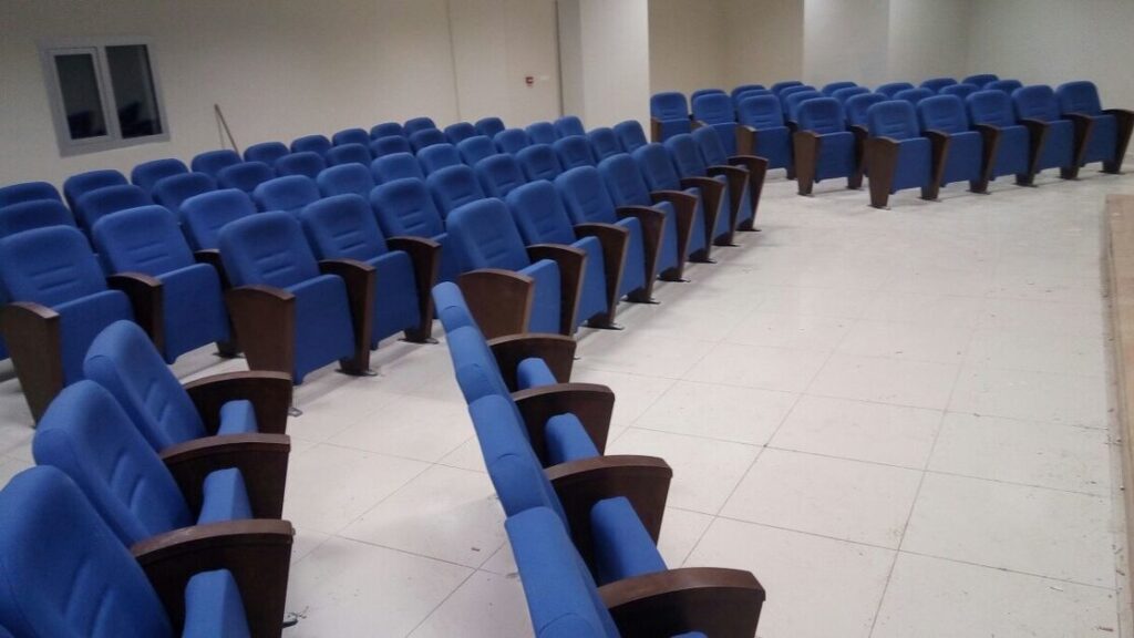 MS 001 Auditorium Seat Back and Seat units are manufactured from water-based polyurethane material with internal metal carcass, in 55 Kg / m3 (ISO845) density, in accordance with international non-flammability (ISO3795) and permanent deformation (ISO1856) standards.MS 001 Auditorium seat The back and seat units taken from hearts are covered with fabric. When the seat unit is out of use, it can be closed with an internal spring system. MS 001 Auditorium seat. Injection-resistant Plastic Covers are integrated behind the back and seat units covered with fabric Friction resistance, colorfastness 180-200 gr / m2 weight, friction fastness100% polyester fabrics are used over 30,000 cycles Metal carcass, fabric-covered decorative wooden box is used for the rails. Fully cloth covered Injection Plastic armrest unit is integrated on the armrests. Back and seat upholstery is built on specially shaped double steel profile carrier legs. Metal body Welding operations are made with gas arc welding and a continuous welding system is applied at the joints. All metal parts are painted with electrostatic powder paint of 80 thickness.